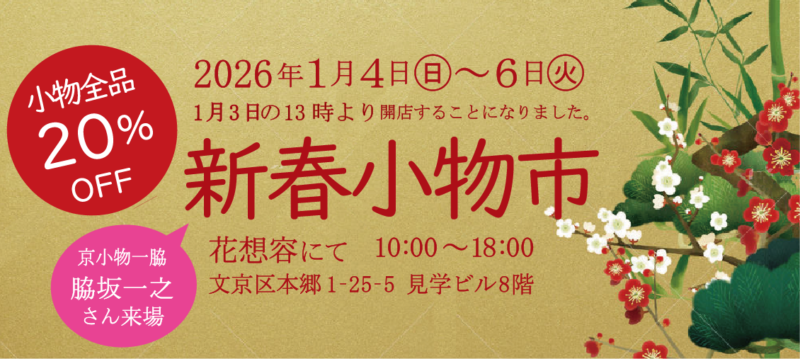 初市では、このほかにも、花想容オリジナルの長襦袢、新作の絞り作品の展示なども行っております。普段、事務室の棚に眠っているアウトレット品なども、お年玉価格で放出します。お楽しみに!